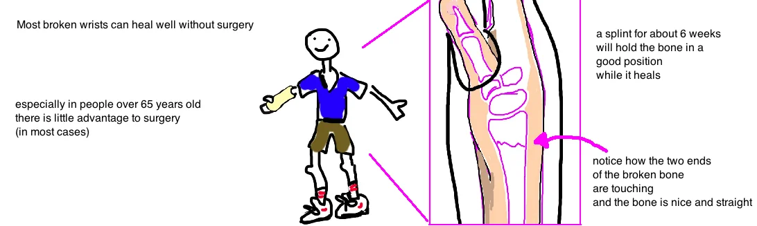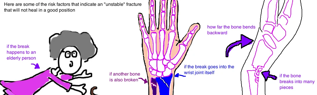 Sometimes even if the wrist gets realigned perfectly, the broken bone is unstable, and it will separate again inside of the splint. Bad fracture have a higher risk of returning to its broken position. In fact, there are certain things that doctors can look at to predict the chance of this happening. These things include the amount of initial displacement (how far apart the bone fragments move), a persons age (older people have thinner bones where are less stable), the number of cracks in the bone ("comminution"), whether the break enters the wrist joint ("intraarticular"), and whether there are other injuries too (like a broken arm etc).