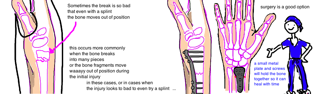 In cases where the broken bone cannot be held in a straight position, surgery is often useful. Surgery uses a small plate and screws to keep the radius bone straight while it has time to heal.