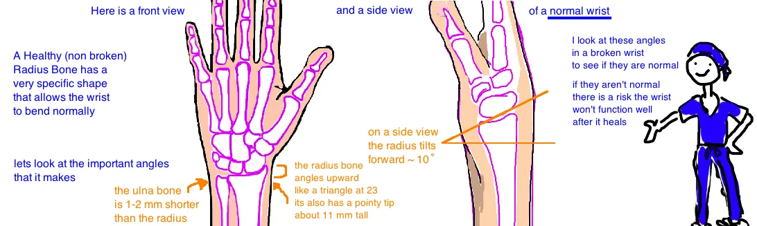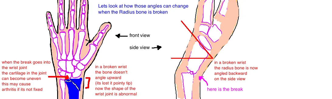 The joint (articular congruity) is the most important thing to return to normal to prevent arthritis, and if there is asymmetry >2mm, theres almost a 100% risk of premature degeneration. Radial height loss changes the motion of wrist and causes loss of strength, loss of inclination causes decreased grip strength.
