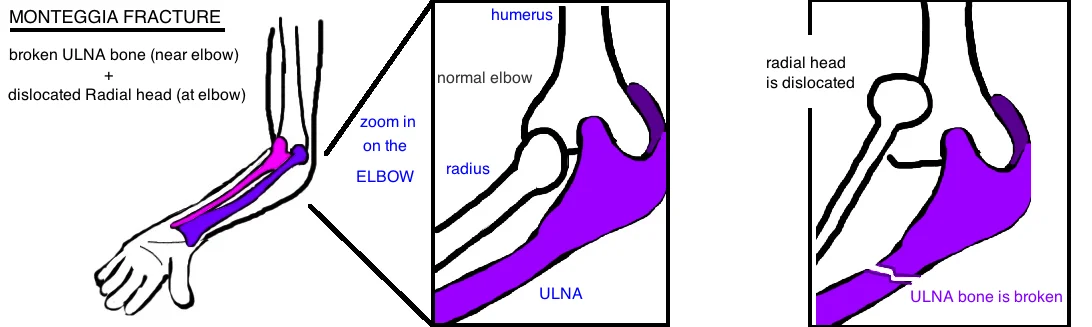 As you move closer to the elbow, the ulna gets thicker, and so a larger force is required to break it. If the Ulna breaks near the elbow, usually a high energy force will travel through both bones, so the ulna bone breaks (the first 1/3 of the bone) and the radius bone often dislocated at the elbow (called a radial head dislocation). This injury pattern is so common that it got its own name: A Monteggia fracture. A Monteggia fracture is most common in kids, but can also be seen in adults.