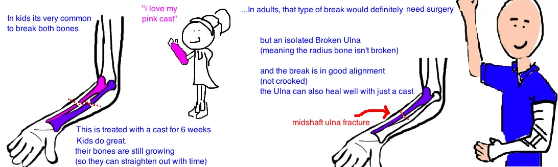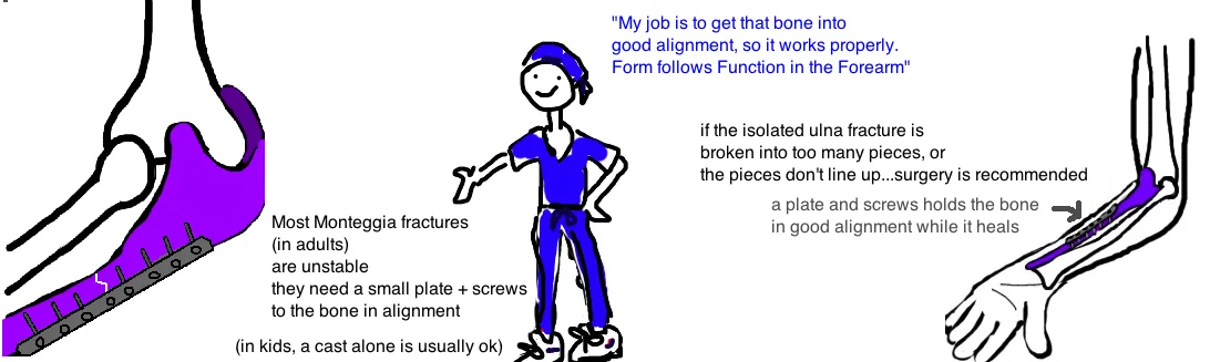 In kids, most of the broken forearms, even the Monteggia type fractures, can be treated successfully without surgery because kids bones are still growing so they heal very well. The injury is fixed by re-aligning the bones (in a Monteggia that means straightening out the ulna, and putting the dislocated radius back into place) while the child is sedated (put to sleep with medicine). A splint or cast is then used to hold the break in normal alignment while the bone heals over the next few weeks. It is very important for Monteggia fractures to be diagnosed and treated as soon as possible because the radial head gets very comfortable once its dislocated, and doesnt like to return to its normal position if left out for a few days (think happy gilmore).