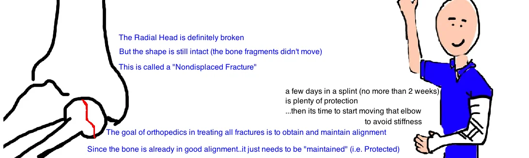 Lastly, the biggest concern with a radial head fractures is the risk for elbow stiffness. Doctors push people to start moving their injured elbows as soon as possible to minimize stiffness.