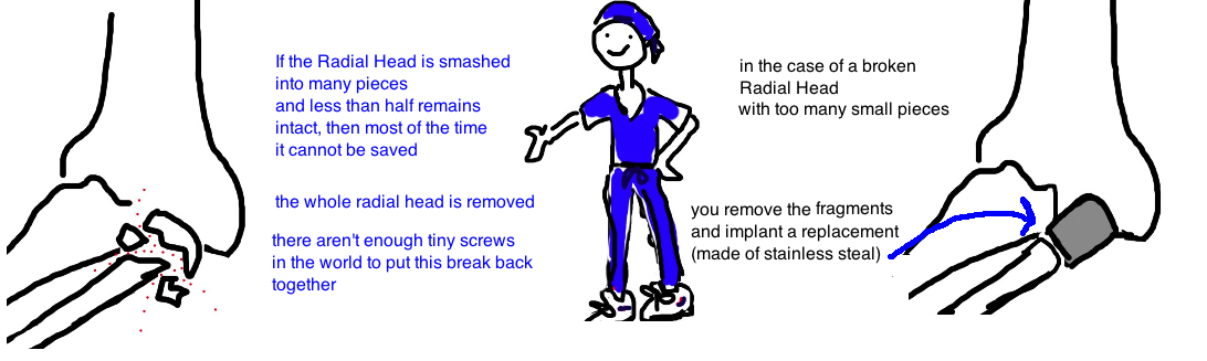 If a radial head gets "shattered", meaning there are multiple breaks (this is also called a "comminuted fracture" or a Mason Type 3 injury), the pieces of bone are often too small to put back together with screws (although sometimes it can be done by a very talented surgeon).